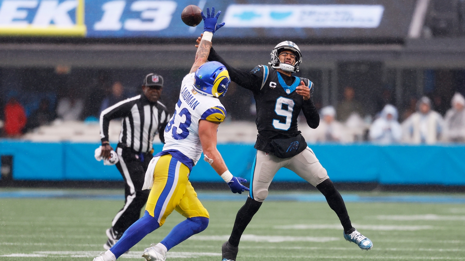 24+ min ago (163+ words) CHARLOTTE, N.C. -- The Los Angeles Rams fell to the Carolina Panthers 31-28 on Sunday. Matthew Stafford's NFL record streak of 28 consecutive touchdown passes in a season without an interception came to an end when he was picked off by Carolina safety Nick Scott in the first quarter. Stafford connected with Davante Adams on a 4-yard touchdown pass on the game's opening possession and was looking for more on the Rams' second drive. But Stafford's third down pass was deflected at the line of scrimmage and Scott intercepted the ball in the end zone. It was Stafford's first interception in 10 weeks. Stafford was then intercepted again on Los Angeles' third drive with cornerback Mike Jackson returning the interception 48 yards for a touchdown to give Carolina a 14-7 lead. The Panthers are playing without top cornerback Jaycee Horn, who is out with a concussion. Stafford…...